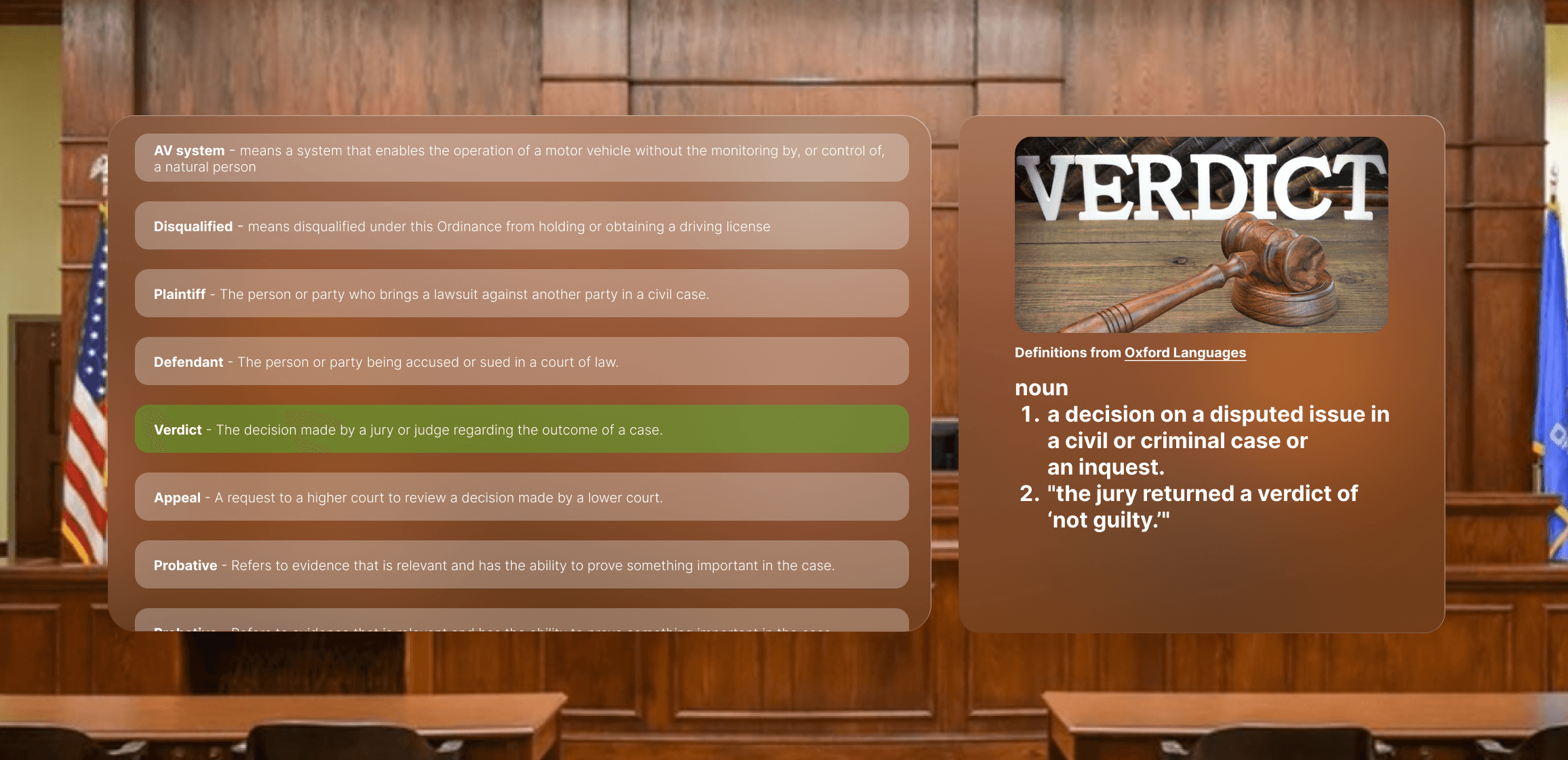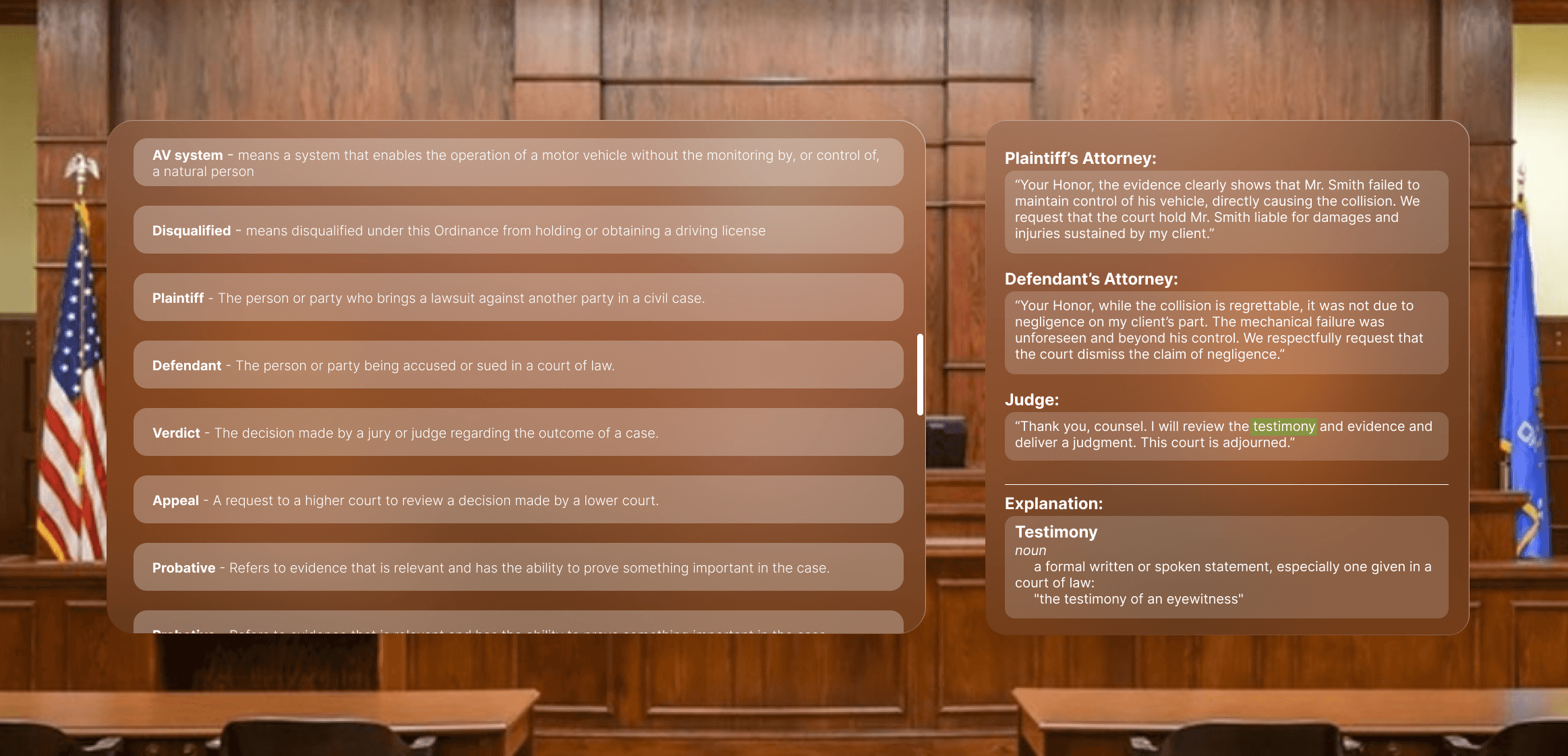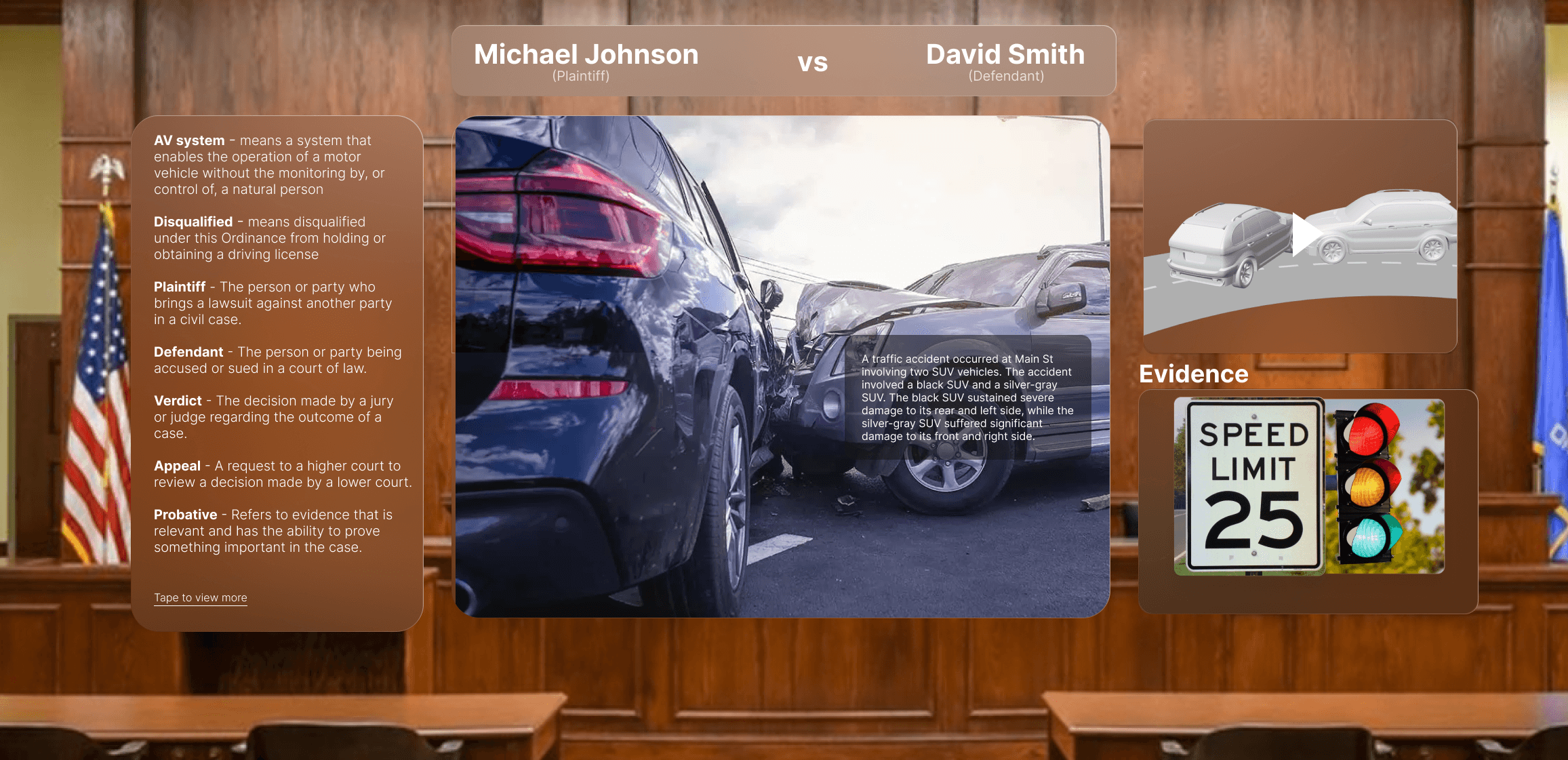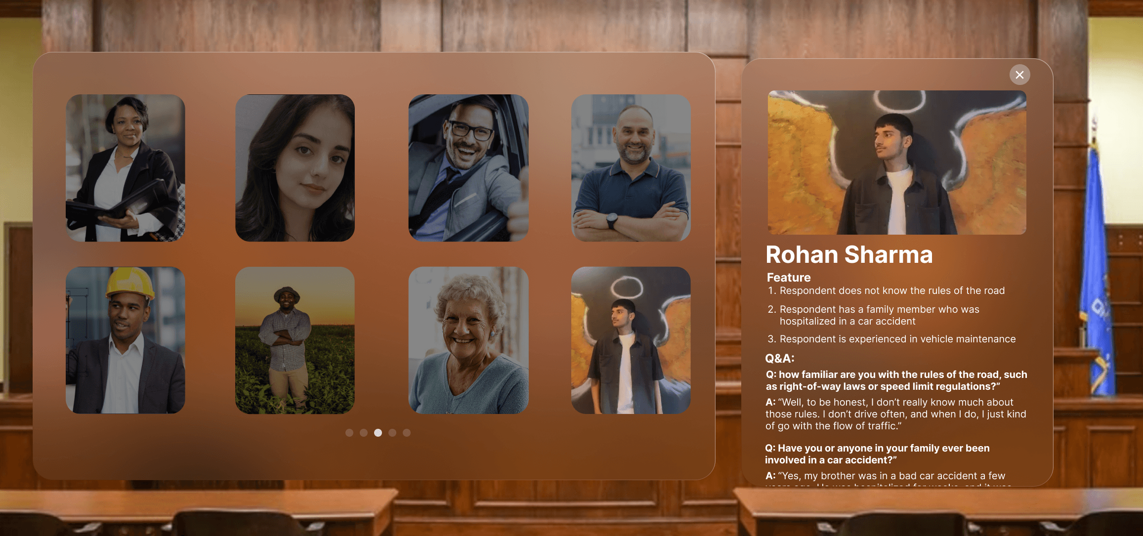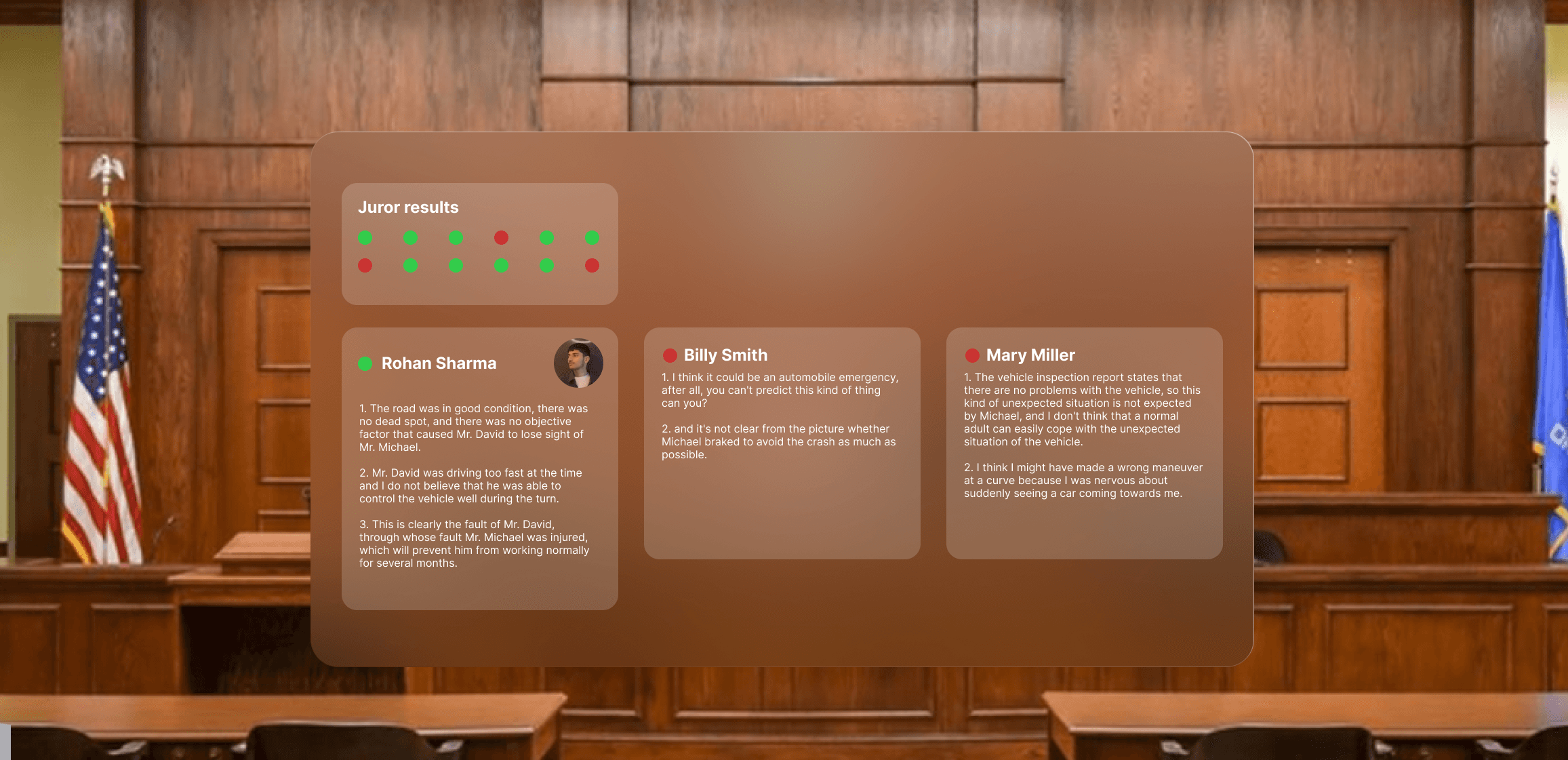 This project integrates AI and Vision Pro to enhance jury selection, case comprehension, and courtroom efficiency. AI assists lawyers in analyzing cases and selecting jurors, while Vision Pro helps jurors visualize evidence and legal details. A digital system streamlines device management and jury voting, making trials smarter and more efficient.