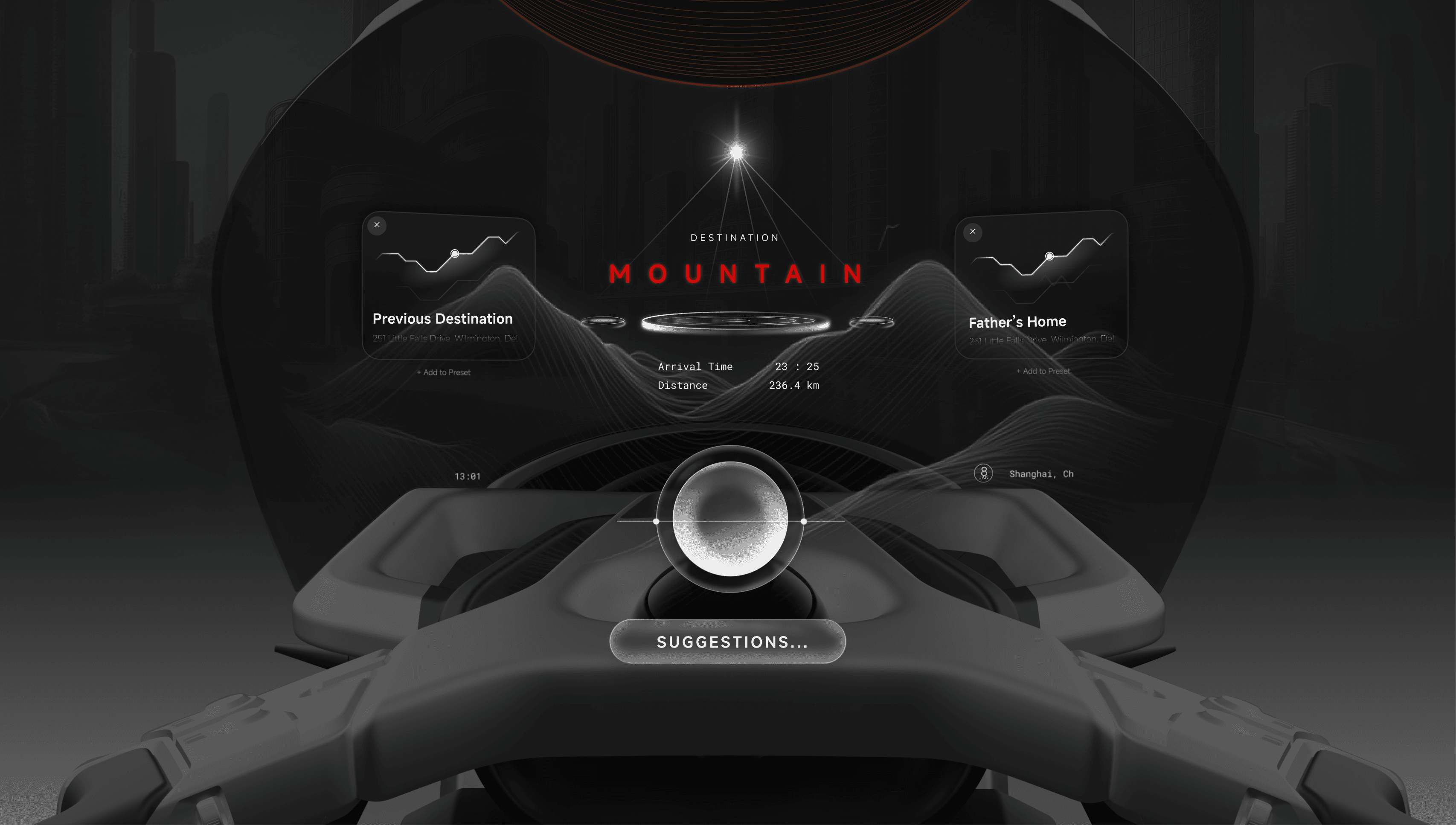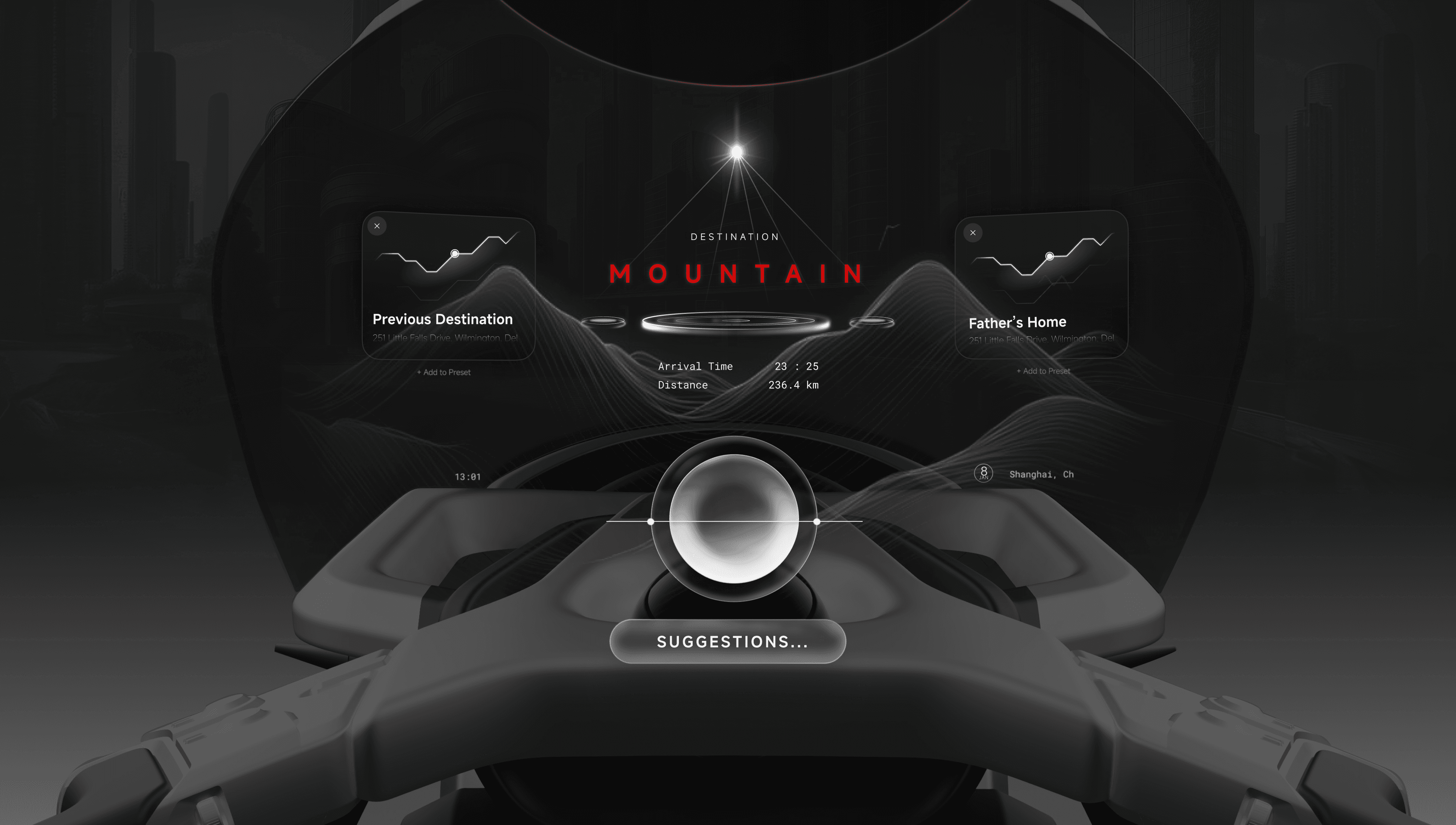 A navigation screen with a central beam highlighting “MOUNTAIN,” wireframe terrain for a futuristic feel, and a central interaction AI assistant sphere. Side cards offer recent destinations, while the dark HUD keeps information clean and focused.